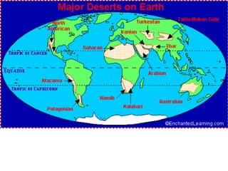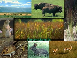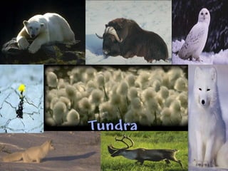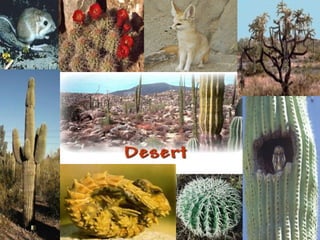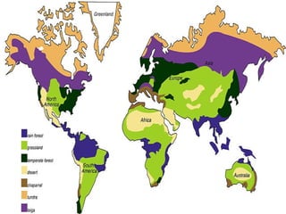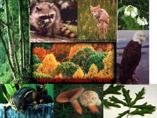 This document provides information about different biomes including temperate deciduous forests, tropical rainforests, deserts, tundra, grasslands, and freshwater and saltwater biomes. It describes the key characteristics of each biome such as average precipitation, temperature, dominant plant and animal species, and adaptations organisms have for surviving in each environment. Examples are given of plant and animal species found in each biome.