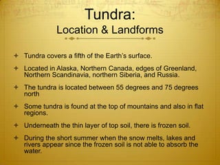 The document provides information about different biomes including tundra, desert, tropical rainforest, taiga, and their key characteristics. It describes the location, climate, flora, fauna, and human populations found in each biome. For tundra, it specifically discusses the Inupiat people of Alaska. For deserts, it focuses on the nomadic Tuareg tribes. And for tropical rainforests, it outlines the Baka Pygmy tribe in central Africa.