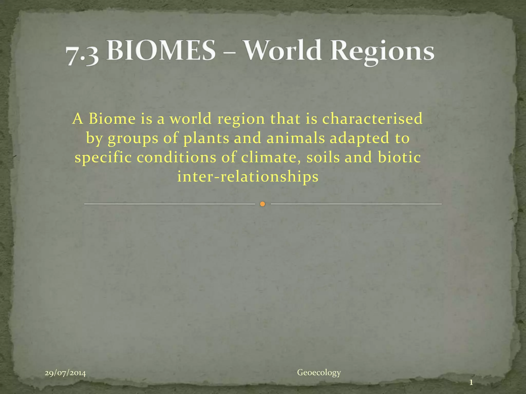 A biome is a geographic region characterized by distinct plant and animal communities adapted to specific climate conditions, soils, and ecological relationships. When describing a biome, key details to include are the definition, location, formation process, climate (temperature and precipitation), soils, plant life, and animal life present in that environment.