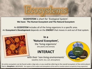 The document explores the concept of ecosystems, defining both human and natural ecosystems, and discusses the ecological systems theory by Urie Bronfenbrenner, which identifies five environmental systems that influence human behavior. It also distinguishes between ecosystems and biomes, providing classifications and different types of biomes based on climate and biological diversity, highlighting the importance of conservation efforts due to human impact. The text emphasizes the complexity and variability in the classification of biomes, mentioning differing opinions on the total number of biomes recognized.