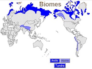 This document summarizes the main biomes (regions) of the world, which include polar ice caps, tundra, forests, grasslands, deserts, and aquatic biomes. It provides details on the defining characteristics, climates, vegetation, and animals found in each biome type. Some of the specific biomes mentioned include boreal forests, taiga, temperate deciduous forests, prairies, steppes, savannas, rainforests, wetlands, estuaries, and oceans.