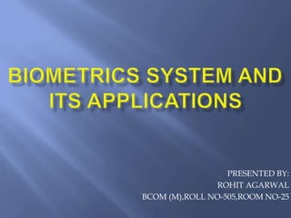 Rohit Agarwal presented on biometrics technology, which uses biological traits like fingerprints, iris scans, and DNA to uniquely identify individuals. The process involves recording biometrics characteristics, converting them into images, encoding and comparing with samples, and storing as a future reference. There are two types of biometrics: behavioral (e.g. hand scanners) and physical (e.g. fingerprint, retina scanners). Biometrics are used for identification, attendance tracking, immigration purposes, generating ID cards, and provide security, safety, and time loss prevention benefits for businesses.