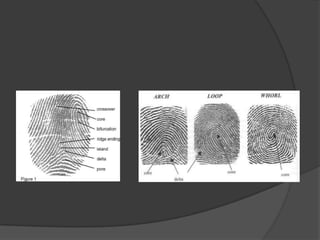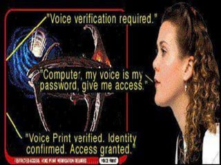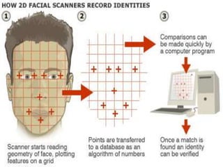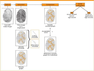 This document discusses biometrics, which uses human body characteristics to authenticate identity. It describes biometric devices that scan and digitize characteristics like fingerprints, irises, voice patterns. Biometrics can be physiological (face, fingerprints) or behavioral (signature, voice). To be used for identification, characteristics must be universal, unique, permanent, collectible, and difficult to circumvent. The document outlines various biometric modalities like fingerprint recognition, face recognition, voice recognition, and iris recognition. It also discusses advantages like accuracy but notes disadvantages like cost and changing characteristics with age, disease, or environment.