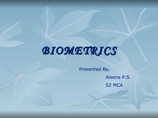 The document discusses biometrics, which is the study of methods for uniquely recognizing humans based on physical and behavioral traits. Some examples of physiological biometrics are fingerprint, face recognition, DNA, hand and palm geometry, and iris recognition. Behavioral biometrics include typing rhythm, gait, and voice. The document then explains the process of biometric systems which involves capturing biometric data, creating a template, storing it in a database, and comparing new captures against stored templates to authenticate users. It discusses some challenges with biometric technologies including privacy issues, discrimination concerns, and the permanence of biometrics.