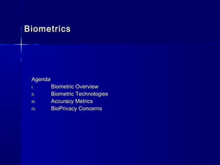 The document provides an overview of biometric technologies used for identity authentication, detailing various methods such as fingerprint, iris, and facial scans, along with their accuracy metrics and security benefits. It discusses bioprivacy concerns and presents a framework for responsible data management, emphasizing the need for user control and data protection. Finally, it highlights the primary drivers for biometric adoption, including technological advancements and increased public awareness.