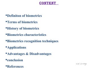 The document provides a comprehensive overview of biometrics, defining it as the automatic identification of individuals through physiological and behavioral characteristics. It covers the history, various recognition techniques (such as fingerprint, face, iris, and voice recognition), applications, and the advantages and disadvantages of biometrics. The conclusion highlights the potential growth of biometrics technology and its promise to enhance privacy and security in the future.