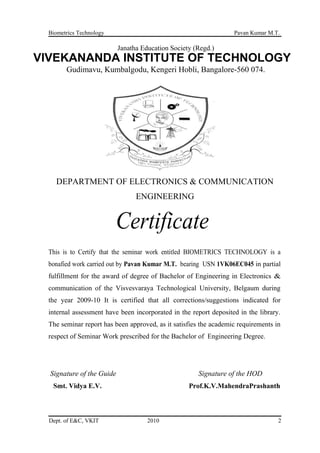 This document is a seminar report on biometrics technology submitted by Pavan Kumar M.T. to fulfill requirements for a Bachelor of Engineering degree. The report provides an introduction to biometrics, which uses human physiological or behavioral characteristics to identify individuals. It discusses the history of biometrics and provides a block diagram of typical biometrics systems. It also classifies and describes various biometric techniques including fingerprints, face recognition, hand geometry, iris recognition, speaker recognition, signature recognition, and gesture recognition.