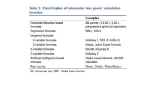 This document provides an overview of biometry and intraocular lens (IOL) power calculation. It discusses the history of IOL implantation and the evolution of crude IOL power calculations to modern biometry methods and formulas. Key aspects covered include the components of IOL power calculation like axial length, corneal power, and effective lens position. Various biometry techniques like ultrasonic measurement, optical biometry, and keratometry are described. Common formulas used in IOL power calculation and the variables that affect calculations are also summarized.