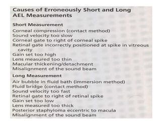 3) Proper technique and accounting for factors like intraocular lens material are important for accurate biometry and intraocular lens power calculation. Inaccuracies can result in postoperative refractive surprises.