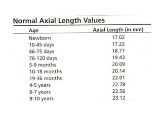 2) Traditional A-scan ultrasound biometry measures axial length using sound waves, but has limitations like variable corneal compression. Newer devices like the IOL Master use optical interferometry and are non-contact.