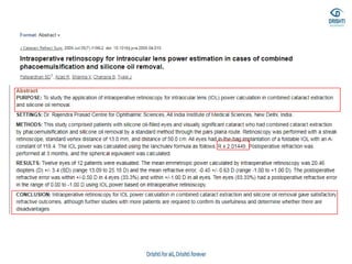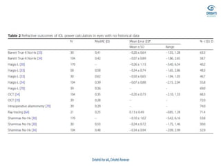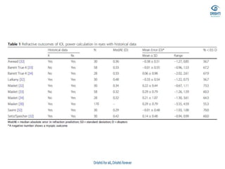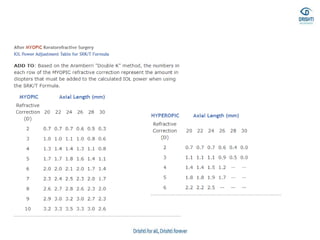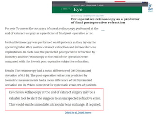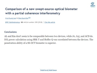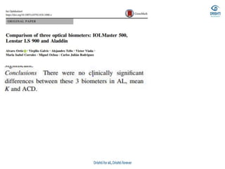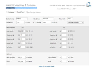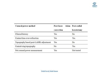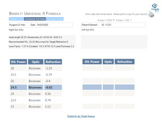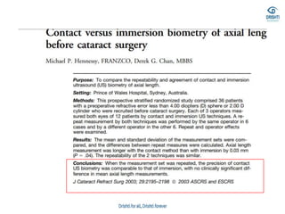 This document discusses various biometry techniques and considerations for accurate intraocular lens (IOL) power calculation in complex cases. It describes tools and methods for measuring ocular parameters in conditions like mature cataracts, posterior staphylomas, and post-refractive surgery eyes. Formulas for calculating IOL power for different IOL types and surgical procedures are presented. Intraoperative techniques like retinoscopy and aberrometry are also covered to optimize refractive outcomes.
