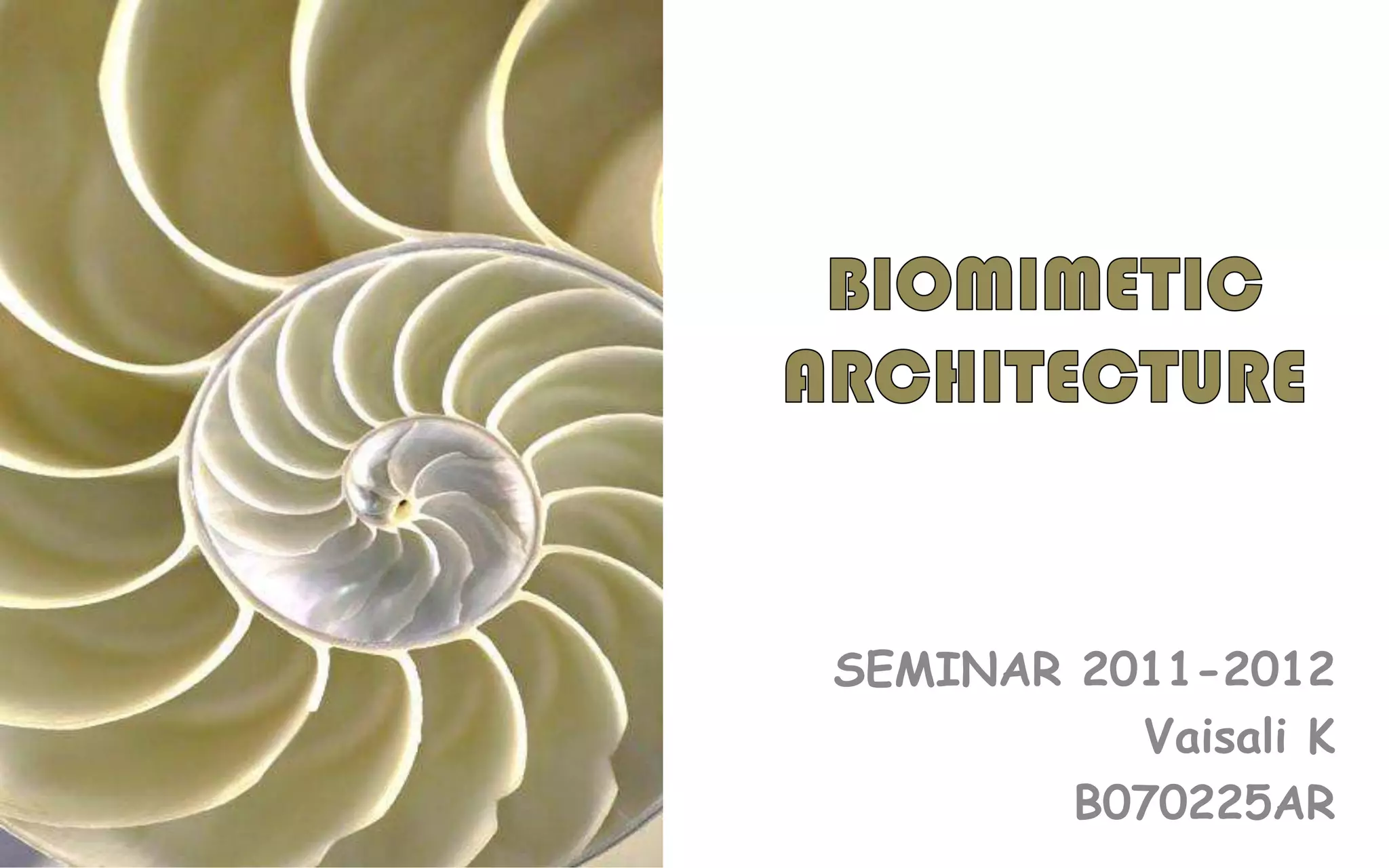 This document outlines the contents and topics to be covered in a presentation on biomimetic architecture. The contents include an introduction to biomimicry, backgrounds on how it began, approaches to biomimicry including design to biology and biology to design. It also discusses principles of biomimicry such as nature running on sunlight and recycling everything. Steps to adopt biomimicry are provided, which include biologizing the question and developing designs inspired by nature. Case studies, analysis, applications and conclusions will also be part of the presentation.