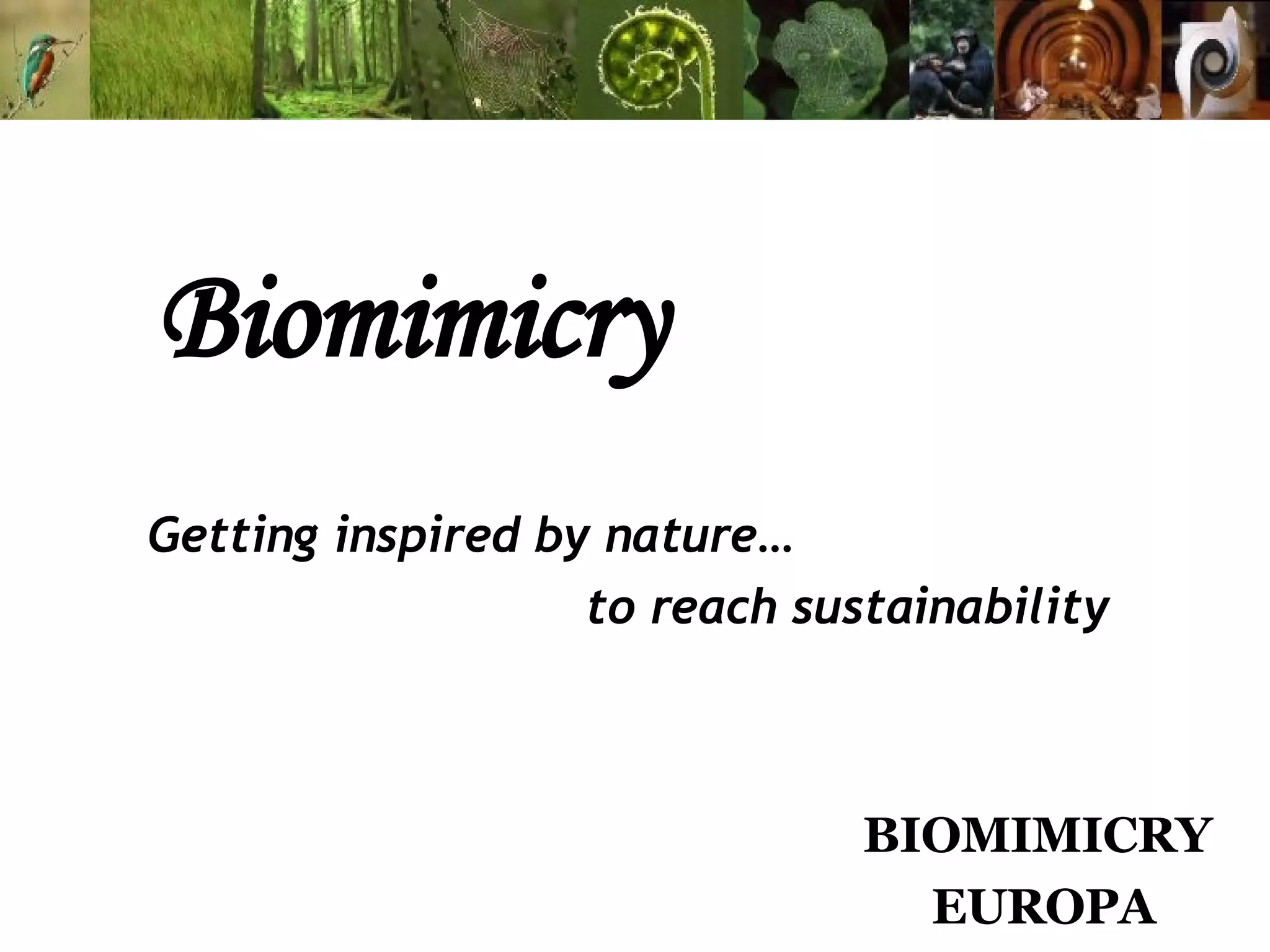 The document discusses various examples of biomimicry, where nature inspires sustainable solutions. It describes how algae inspire efficient fluid mixers that can save up to 50% energy. Termite mounds ventilate buildings with up to 90% efficiency savings. Antarctic sponges inspire stronger optical fibers produced at ambient temperatures. Leaves harness light twice as efficiently for photovoltaics. Seashells use CO2 from smokestacks as building material. Primary forests demonstrate waste-free material cycling that saves fossil fuels. Enzymes inspire soft chemistry without waste through shapes, processes, and ecosystems.