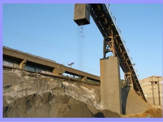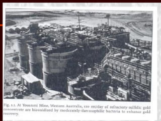 Biomining and bioleaching use microorganisms like Thiobacillus ferrooxidans to extract metals from ores and mine tailings. These microbes facilitate metal extraction by oxidizing metals or the minerals containing them, making the metals soluble so they can be recovered. Key applications include extracting copper, gold, and uranium, as well as remediating acid mine drainage. As high-grade surface deposits diminish, biomining will become increasingly important for recovering metals from lower-grade ores in a more sustainable and cost-effective manner than conventional mining and extraction methods.
