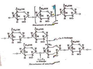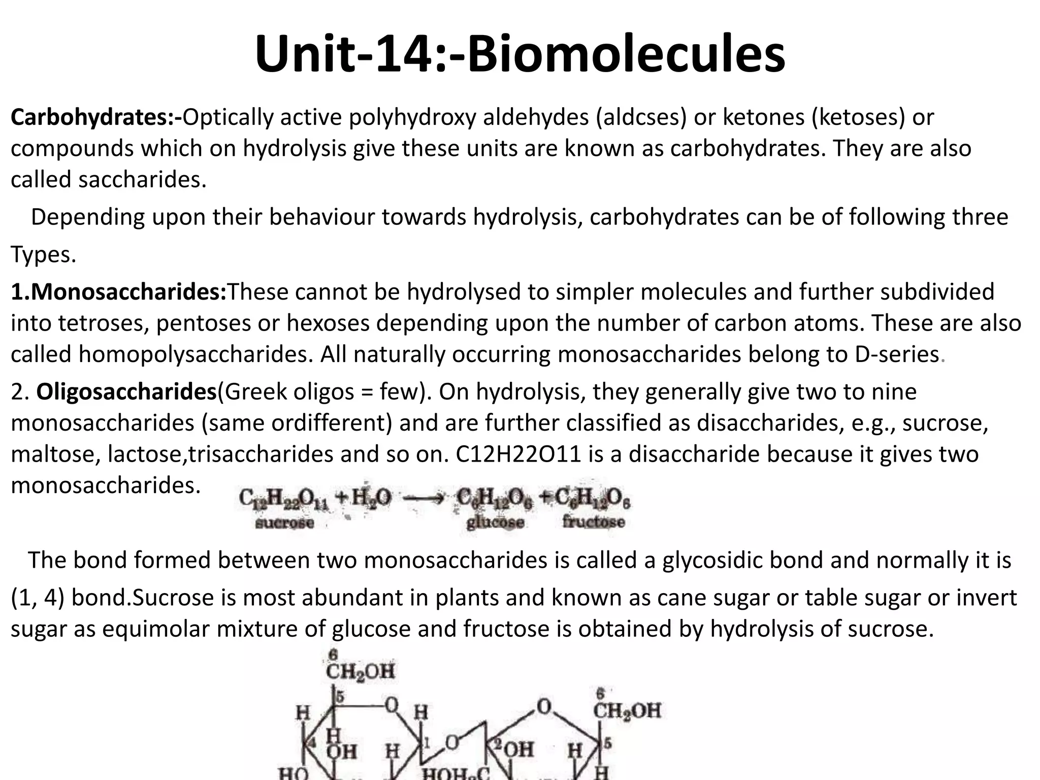 This document provides information about biomolecules including carbohydrates, proteins, lipids, and nucleic acids. It discusses the structures, properties and functions of monosaccharides, polysaccharides, proteins, enzymes, amino acids, lipids, and nucleic acids. Key points include: carbohydrates include monosaccharides, oligosaccharides, and polysaccharides; proteins are made through the linking of amino acids and have primary, secondary, tertiary, and quaternary structures; lipids include fats, oils, waxes, and phospholipids; nucleic acids DNA and RNA carry genetic information and have nucleotide bases that allow for base pairing.