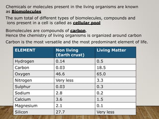 This document discusses biomolecules. It begins by defining biomolecules as chemicals or molecules present in living organisms. The sum total of different types of biomolecules, compounds, and ions present in a cell is called the cellular pool. Biomolecules are compounds of carbon, so the chemistry of living organisms is organized around carbon. The major biomolecules in cells include inorganic molecules like minerals and gases, organic molecules like carbohydrates, lipids, proteins, and nucleic acids, and smaller molecules like amino acids and nucleotides.