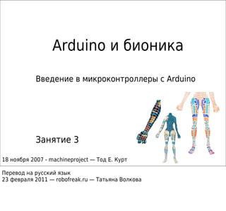 Документ содержит руководство по использованию Arduino для управления моторами постоянного тока, транзисторами и пьезо-пищалками. Он объясняет, как подключать различные компоненты, настраивать схемы и писать программы для управления устройствами через Processing. Также упоминаются важные аспекты работы с электричеством и схемотехникой, включая полярность и защиту от электрических скачков.