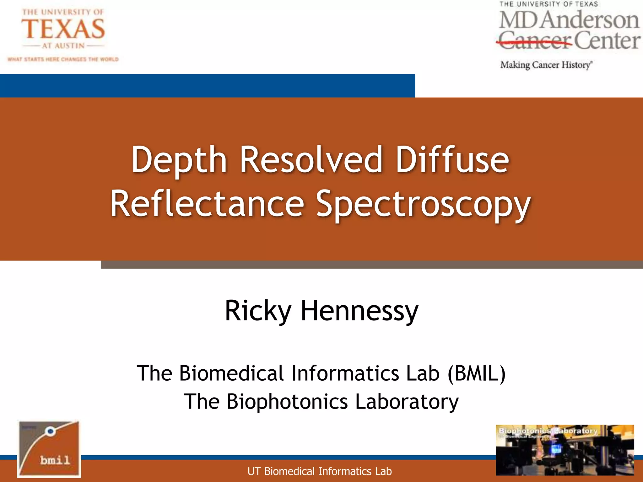 This document provides an overview of diffuse reflectance spectroscopy (DRS) and its applications in biomedical research. DRS uses non-invasive optical measurements to extract information about tissue optical properties and composition. It describes how light interacts with tissue through absorption and scattering. The document also discusses techniques for modeling light transport in tissue, such as Monte Carlo simulations and the development of lookup tables to relate tissue optical properties to DRS measurements. This allows DRS data to be analyzed to determine properties like hemoglobin concentration and oxygen saturation in tissue.