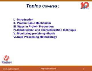 This document discusses the significance of biologics in therapeutics compared to traditional small molecules, detailing their production, characterization, and monitoring processes. It covers various chapters, including protein mechanisms, therapeutic protein production, and data processing methodologies in biopharmaceuticals. Key aspects include the complexity of protein structures, techniques for protein characterization, and the importance of post-translational modifications.