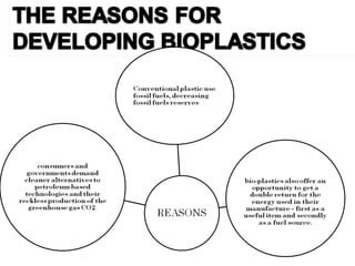 The document discusses bioplastics, particularly polyhydroxybutyrates (PHB), their production from renewable biomass, and their biodegradable properties compared to conventional plastics. It outlines the advantages of bioplastics, such as reduced greenhouse gas emissions and potential applications in various industries. The text emphasizes the evolving technology that may further enhance the benefits and cost-effectiveness of bioplastics in the future.