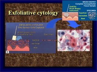 Biopsy is the removal and examination of tissue to diagnose a condition. It can be excisional, removing the entire lesion, or incisional, removing part of a lesion. Indications include persistent lesions without a clear cause, suspected tumors or malignancies, and lesions interfering with function. Contraindications are poor health and acute infection. Types include punch, frozen section, aspiration, and exfoliative cytology. Care must be taken in design, handling, and potential dangers like spreading or infection. Biopsy provides diagnostic and treatment guidance.