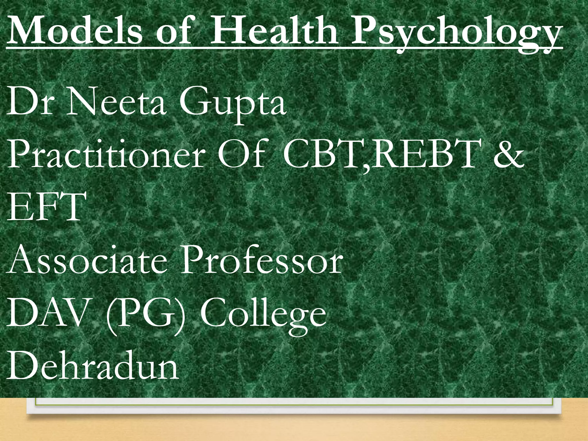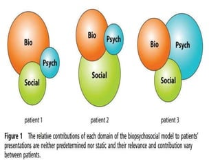The document discusses models of health psychology, focusing on the biopsychosocial model. The biopsychosocial model views health and illness as influenced by biological, psychological, and social factors. It was first proposed by George Engel in 1977 as an alternative to purely biomedical models. The model examines the interconnections between biology, psychology, and socio-environmental factors in topics like health, disease, and human development. Strengths include improved patient outcomes, while limitations include being time-consuming and lacking a strong theoretical basis.