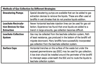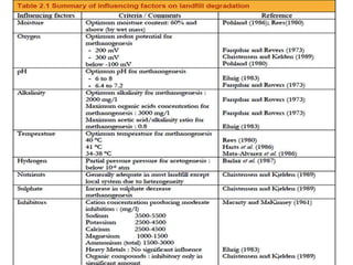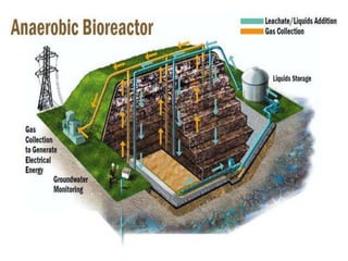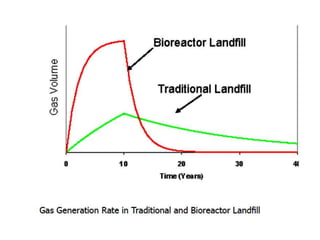This document provides an introduction to bioreactor landfills. It discusses that bioreactor landfills actively manage liquid and gas conditions to accelerate waste stabilization compared to conventional landfills. There are three main types - aerobic, anaerobic, and hybrid bioreactor landfills. Bioreactor landfills require technologies like liquid or air addition to control waste stabilization processes. They can stabilize waste in 5-10 years compared to 30-50 years for conventional landfills. Monitoring categories include leachate, landfill gas, and waste characteristics to optimize the waste stabilization process.