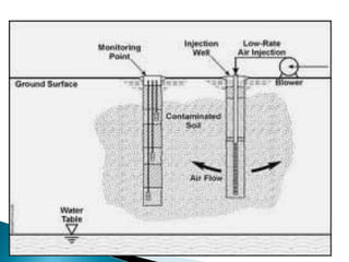 Bioremediation uses microorganisms and plants to degrade contaminants in various environments like soil, water and air. There are different types of bioremediation including in situ which treats contamination at the site, and ex situ which treats it off site. Bioremediation strategies can be intrinsic, which relies on natural degradation, or engineered, where conditions are modified to enhance microbial activity. Common bioremediation techniques involve bioventing, bioaugmentation, composting, land farming and constructing biopiles.