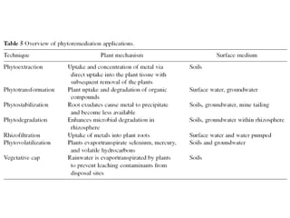 Bioremediation uses living organisms such as bacteria and fungi to degrade environmental contaminants into less toxic forms. There are two main types - in situ bioremediation, which treats contaminants where they are found, and ex situ, which treats extracted soil and water. Common in situ techniques include bioventing, biosparging and monitored natural attenuation. Ex situ approaches involve land farming, composting and biopiles. The effectiveness depends on the microbes present, environmental conditions and contaminant properties.