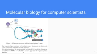 This document discusses molecular biology concepts for computer scientists and tools for creating glossaries and displaying acronyms. It introduces BioRender, a tool for creating biological diagrams and illustrations. It then evaluates different LaTeX packages for creating glossaries and displaying acronyms, finding that the glossaries-extra package allows for creating both a glossary and acronyms. It concludes that BioRender is easy to use and has a useful icon library, and that glossaries-extra is effective for defining terms and acronyms.