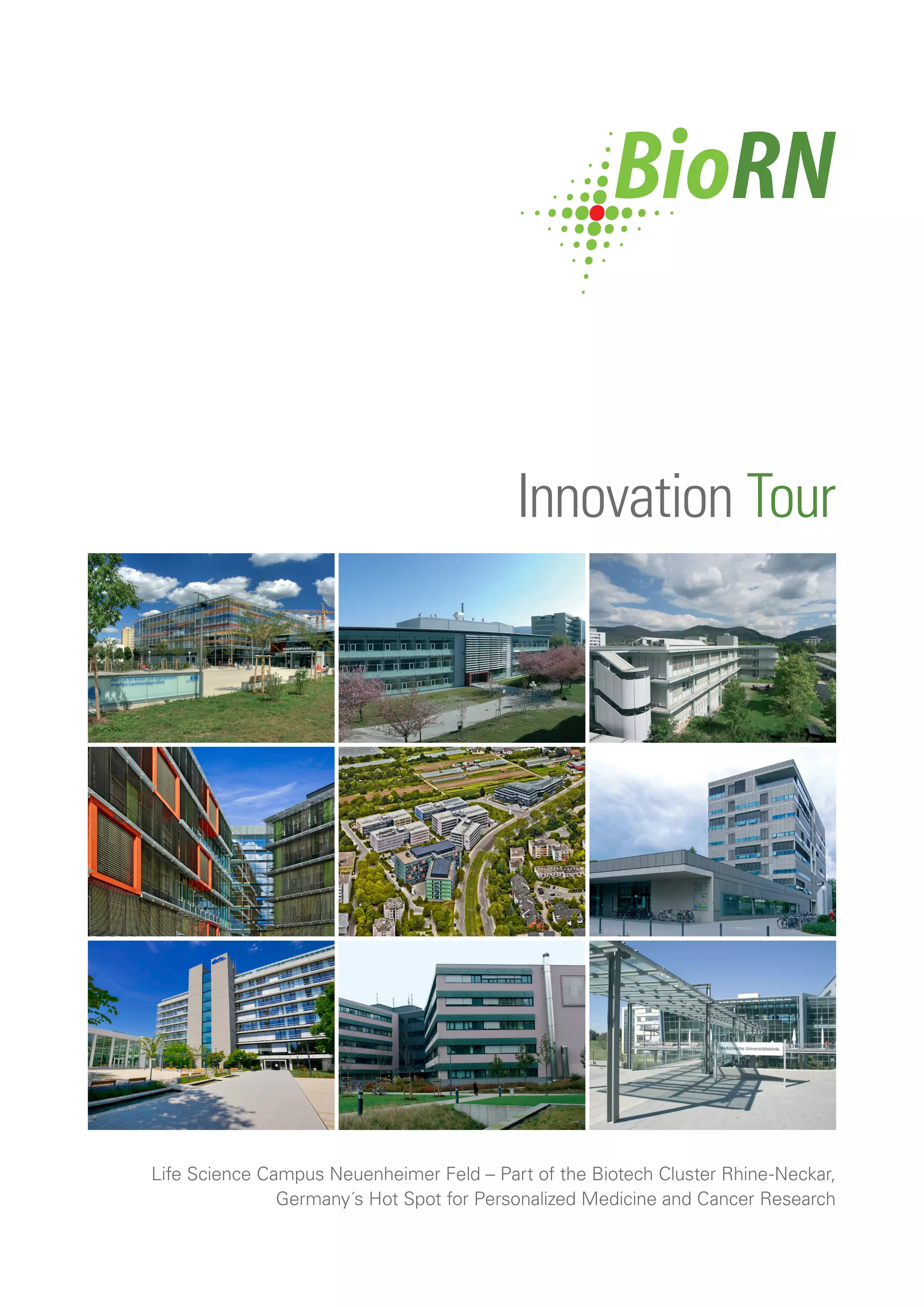 The document provides information about an innovation tour of the Life Science Campus Neuenheimer Feld in Germany, which is part of the Biotech Cluster Rhine-Neckar known for its expertise in personalized medicine and cancer research. The tour highlights several institutions on the Heidelberg University Campus including the Faculty of Biosciences, Faculty of Medicine, Heidelberg University Hospital, National Center for Tumor Diseases, German Cancer Research Center, and several research centers and institutes. The innovation tour is intended to showcase the concentrated knowledge and expertise in medical and biotechnical research in the cluster.