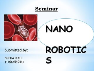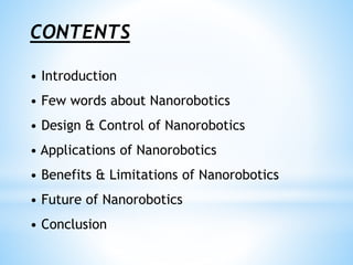 This document provides an overview of nanorobotics including definitions, design and control, applications, benefits and limitations. It discusses how nanorobotics refers to robots or machines created at the nanoscale and how research in this area began in the 1980s. Applications mentioned include using nanorobots for medical purposes like removing tumors or treating diabetes as well as in space exploration. Benefits include faster medical treatment while limitations include potential environmental and health impacts. The future of nanorobotics is discussed in areas like industry, computing and healthcare.