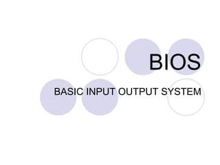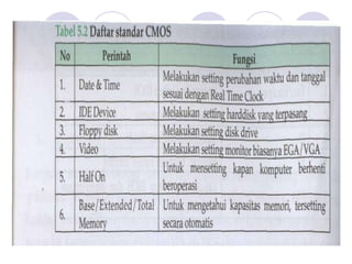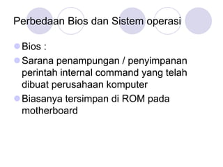 Dokumen ini menjelaskan tentang BIOS (Basic Input Output System) yang berfungsi sebagai penyimpanan perintah internal untuk mengontrol kegiatan sistem kerja komputer. BIOS melakukan pengecekan terhadap hardware dan berbagai jenis BIOS seperti Award, AMI, dan Phoenix disebutkan. Selain itu, cara memasuki BIOS di komputer juga dijelaskan dengan menekan tombol tertentu saat komputer dinyalakan.