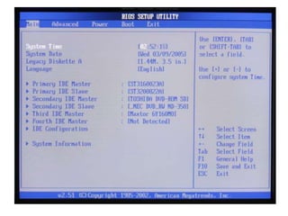 The BIOS is located on a chip on the motherboard and initializes hardware at startup. It detects components and checks for errors using POST codes. The BIOS is stored in ROM and cannot be changed by users. To enter the BIOS setup utility, the user presses keys like Delete, F1, or F10 during startup. Common BIOS manufacturers include Award, IBM, Intel, and AMI. The booting process involves powering on, POST to check hardware, and the BIOS loading the operating system if no errors occur. POST codes help diagnose issues and are displayed as beeps, numbers, or text messages corresponding to components like the motherboard, RAM, keyboard, or hardware in general.