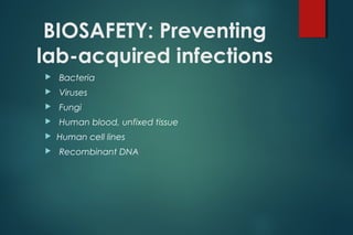 This document discusses biosafety guidelines for working with biological agents in a laboratory setting. It outlines different levels of containment (BL1-BL4) required for microorganisms based on their hazard potential, from basic practices for BL1 up to maximum containment measures like positive pressure suits for BL4. Standard practices like hand washing, prohibiting eating or smoking, and proper disposal of sharps and waste are reviewed. Regulations on bloodborne pathogens and shipping infectious substances are also mentioned.