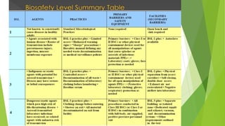 This document discusses biosafety levels for working with microorganisms. It describes the four biosafety levels from BSL-1 to BSL-4, providing more stringent safety protocols for higher levels that involve more dangerous pathogens. BSL-1 involves well-characterized microbes and requires standard practices like handwashing. BSL-2 adds personal protective equipment, waste decontamination, and controlled access. BSL-3 further restricts access and requires respiratory protection due to airborne risks. BSL-4 is for dangerous exotic pathogens and requires the most stringent containment and protective equipment, including full body isolation suits.