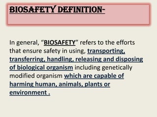The document discusses biosafety definitions, biological risk assessment, and guidelines for working with genetically modified organisms (GMOs). It defines biosafety as ensuring safety in using, handling, and disposing of biological organisms. Risk assessment of GMOs involves characterizing the agent, identifying hazards, evaluating risks, and applying management strategies. The guidelines classify GMOs based on their history of safe use and specify containment levels and approvals required for field testing.