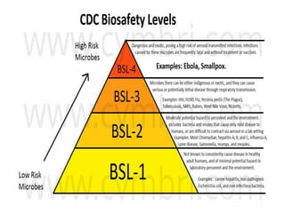 This document discusses biosafety and biosafety cabinets. It defines biosafety as safety precautions that reduce risk of exposure to infectious materials. There are 4 biosafety levels depending on the risk of the microbe, with level 4 being the highest risk. Biosafety cabinets provide protection to personnel, environment, and products being handled. There are 3 classes of biosafety cabinets - Class I provides personnel and environmental protection; Class II provides personnel, environmental, and product protection; Class III provides highest level of containment for dangerous pathogens. The document outlines practices for different biosafety levels and cabinet classes.