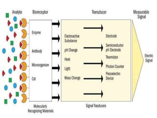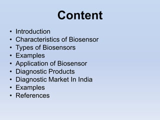 This document discusses biosensors and diagnostic products. It defines a biosensor as a device that combines a biological component with a physicochemical detector to detect analytes. It describes different types of biosensors including calorimetric, potentiometric, electrochemical and optical biosensors. It also discusses applications of biosensors in glucose monitoring, environmental monitoring, and pathogen detection. The document then defines diagnostic products and provides an overview of the diagnostic market in India including types, size, growth rate and examples.