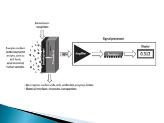 Biosensors are devices that detect specific substances or analytes, such as glucose and lactate, by producing electrical signals proportional to their concentrations. They consist of a biological component that interacts with the analyte and a transducer that converts this interaction into measurable electrical impulses. Various types of biosensors include calorimetric, potentiometric, amperometric, and optical, each utilizing different physical principles to measure biochemical reactions.