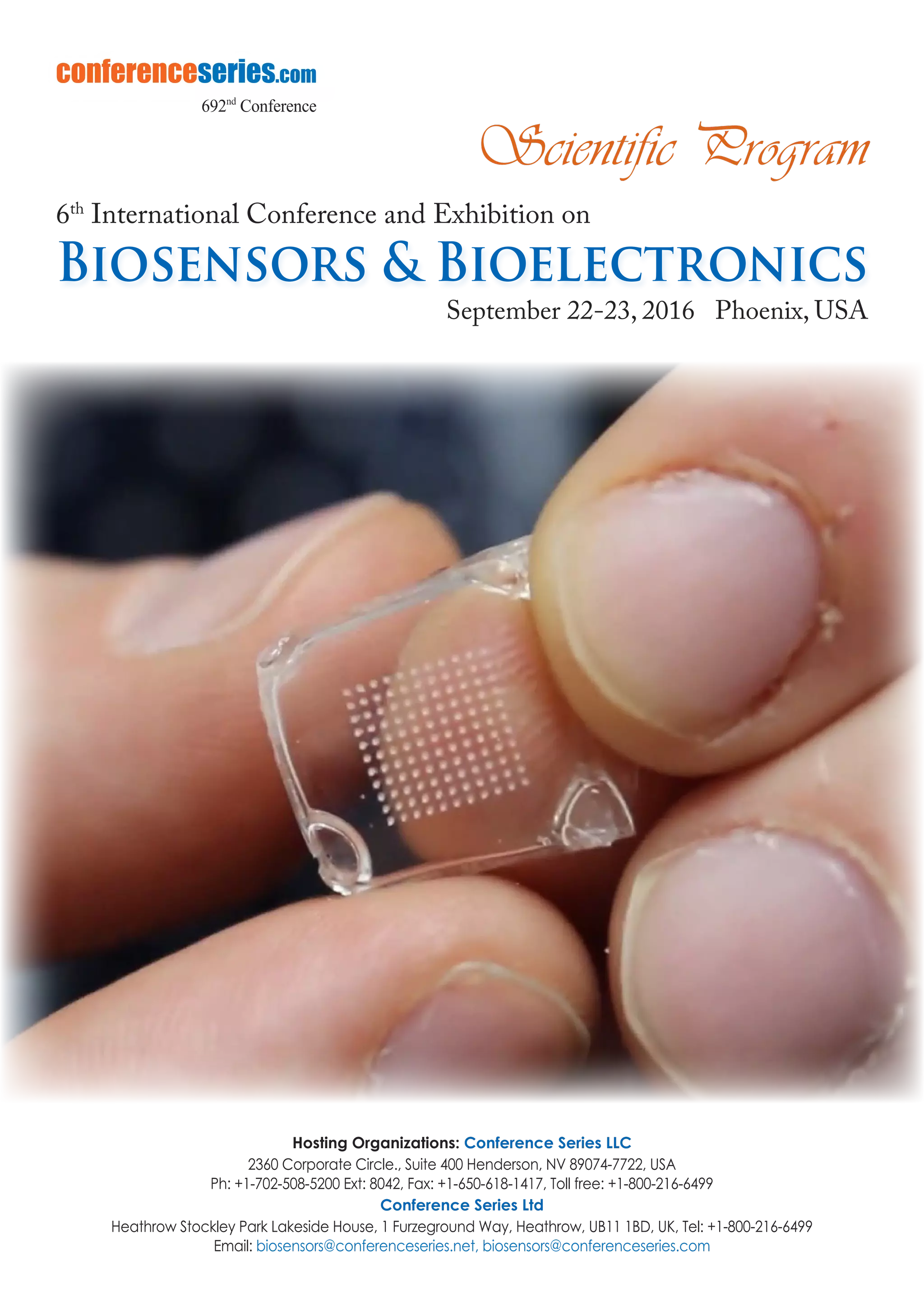 The document outlines the agenda for the 6th International Conference and Exhibition on Biosensors & Bioelectronics, held on September 22-23, 2016, in Phoenix, USA. It includes keynotes, sessions on various biosensor applications, networking opportunities, and details about registration and venues. The conference features a wide range of topics, including biosensors for health diagnostics, environmental monitoring, and emerging technologies.