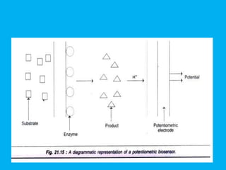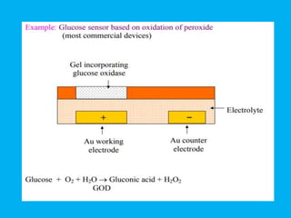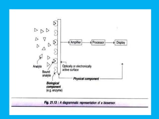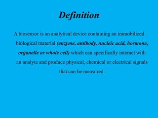 Biosensors are analytical devices that employ immobilized biological materials to interact with analytes, producing measurable signals related to their concentration. They are classified into various types, including catalytic, affinity, electrochemical, optical, and whole cell biosensors, each with specific methodologies for detection and application in fields such as medical diagnostics and environmental monitoring. Future developments in biosensor technology aim for multianalyte capabilities, miniaturization, and integration into implantable devices.