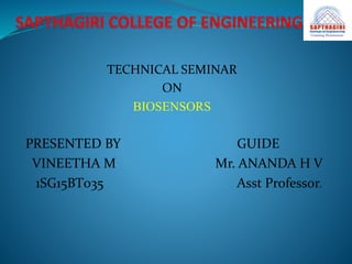 The document is a technical seminar presentation on biosensors, covering their introduction, history, principles, types, applications, and advantages/disadvantages. It explains the functioning of various biosensors, such as glucose, thermal, electrochemical, and DNA biosensors, and their applications in medical diagnostics and environmental monitoring. It also discusses the fabrication and instrumentation of biosensors and highlights the benefits and limitations of these analytical devices.