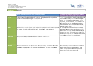 The document summarizes key elements of the soundtrack from the video game Bioshock. It describes the setting as moving from a plane crash into the ocean to an underwater city. It notes the mood was meant to be creepy and mysterious. Production techniques used included recorded or stock sounds edited for the setting, lowering the pitch and slowing playback of sounds to suggest being underwater, string instruments and drums to set the ominous tone, and voice acting with added effects to sound like 1940s recordings.