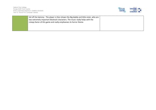 The document analyzes the soundtrack from the video game Bioshock. It describes a scene where the player's character injects himself with a mysterious plasmid, causing him to fall from a balcony. The music in this scene establishes a mood of creepiness, fear, and tension through the use of high pitched string instruments and eerie ambient sounds. It suggests the music was produced in a recording studio and using VST plugins to create the string instruments and ambient noises. The summary effectively conveys the key details about the scene, music, and production techniques being discussed in the document in a concise manner.