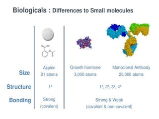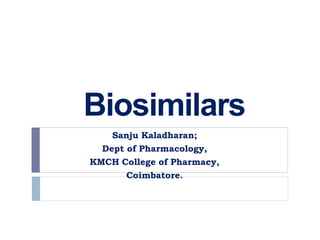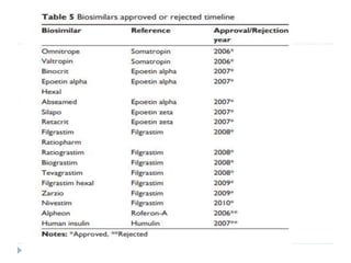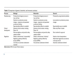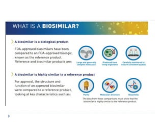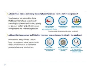 Biosimilars are biologic medicines that are developed to be similar to existing approved biologic medicines known as reference medicines. Biosimilars must demonstrate similarity to the reference medicine in terms of quality, safety and efficacy through comprehensive testing and analysis. While biosimilars may provide reduced costs and increased access to biologic treatments, they are more complex than traditional small molecule drugs due to differences in size, structure, manufacturing processes, and potential for immunogenicity. Thorough evaluation and regulation is required to ensure biosimilars are interchangeable for the reference product without compromising patient safety.
