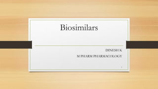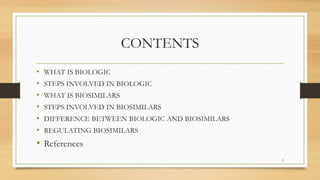 The document discusses biosimilars, which are biologic medicines that are similar but not identical to an original biologic. It describes the complex multi-step process used to develop and test biosimilars. This includes characterizing the original biologic, developing a unique cell line and process, testing for similarity through analytical and non-clinical studies, and clinical trials. Regulatory agencies oversee biosimilars differently than generics due to concerns over safety, substitution, naming, and labeling of the non-identical products.
