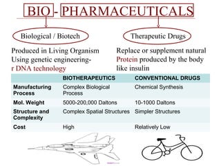 This document discusses biosimilars in India and the opportunities and challenges in the biosimilars industry in India. It defines biosimilars and provides an overview of the global and Indian biosimilars market and regulatory landscape. The key opportunities for India include providing affordable treatment options and commercial benefits from lower cost manufacturing. However, challenges include regulatory hurdles, concerns around quality and safety, high development costs, and physician reluctance to prescribe biosimilars.