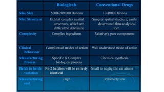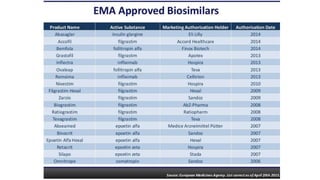 Biosimilars are biotherapeutic products that are similar to already approved reference biologics in terms of quality, safety and efficacy. They are developed to be highly similar but not identical to existing biologics. Regulatory agencies like EMA and FDA require extensive analytical, non-clinical and clinical studies including pharmacokinetic, immunogenicity and clinical efficacy trials to establish biosimilarity. While biosimilars could increase access and lower costs, issues related to efficacy, safety, substitution and labeling need to be addressed to ensure patient safety and appropriate use.