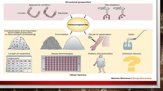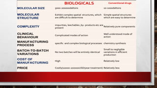 This document discusses biologics and biosimilars. It defines biologics as biological products made from natural sources like humans, animals or microorganisms that are used to treat or prevent diseases. Biosimilars are highly similar versions of biologics that are approved because they have no clinically meaningful differences. The document outlines key differences between biologics and biosimilars like regulatory pathways and development testing. It also compares biosimilars to generics and discusses important considerations for biosimilar development like immunogenicity, bioequivalence and post-translational modification.